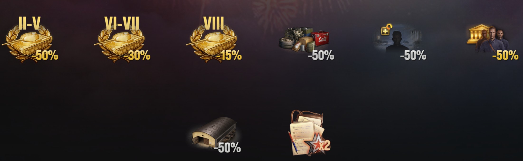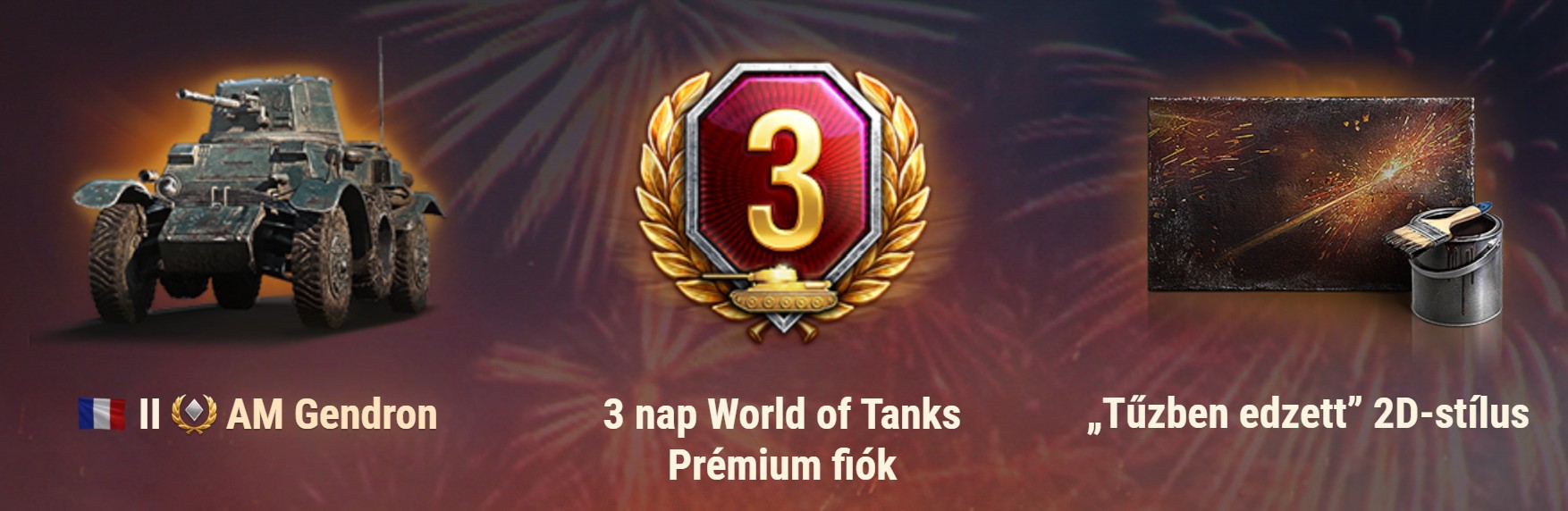 Mindenki, aki a születésnapi esemény alatt ellátogat a garázsába, megkapja az II AM 39 Gendron-Somua tankot, három nap World of Tanks prémium fiókot és a „Tűzben edzett” 2D-stílust születésnapi ajándékként! És hálánk jeléül mindenkinek, aki hozzájárult ahhoz, hogy a játék azzá váljon, ami ma, elképesztő játékon belüli kedvezményeket kínálunk.