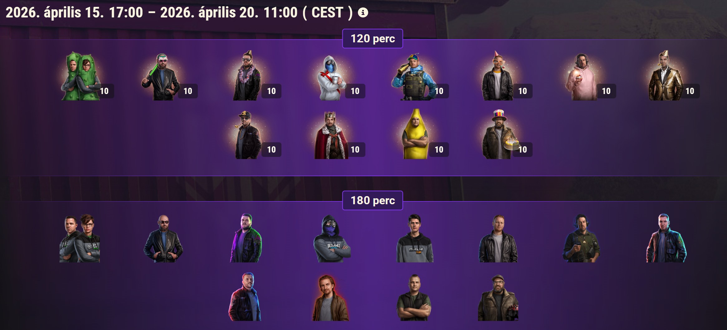Miután begyűjtötted a dropokat a Twitch-en, mindenképp jelentkezz be a játékba 2026. április 20., 11:00 (CEST) előtt, hogy megkapd őket.