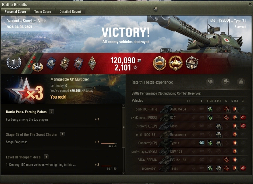 Valami különlegeset szerettem volna erre a kerek számra, ez sikeredett. Nekem egyébként nem jött be túlságosan a tank, az egyetlen fegyvere az, hogy gyorsan pozícióba ér a csata elején, de utána 1v1-ben bármivel szemben gyenge. A gun horribilis, rendesen beleőszültem egy-két csatába. Cserébe megdöntöttem vele a spotrekordomat